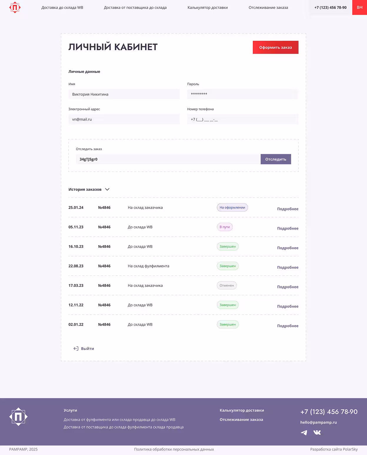PAMPAMP — сайт сервиса доставки на Wildberries: два сценария, расчёт и отслеживание онлайн.