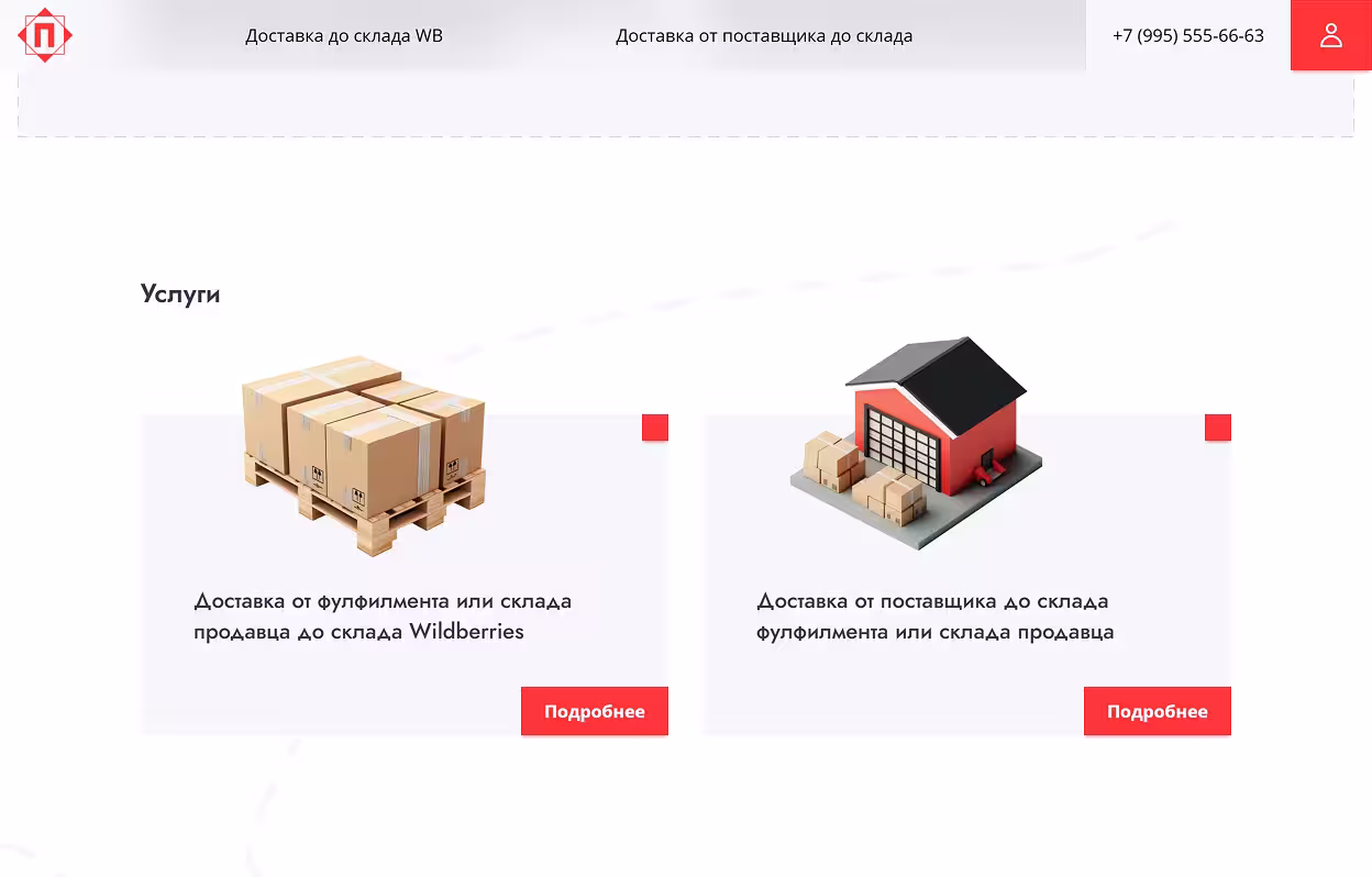 Мы оформили понятный поток: каталог «Услуги» с двумя направлениями ведёт на страницы с краткими пояснениями и CTA; вынесены быстрые действия — «Рассчитать стоимость» и «Отследить заказ», чтобы сразу перейти к расчёту и трекингу без лишних шагов.