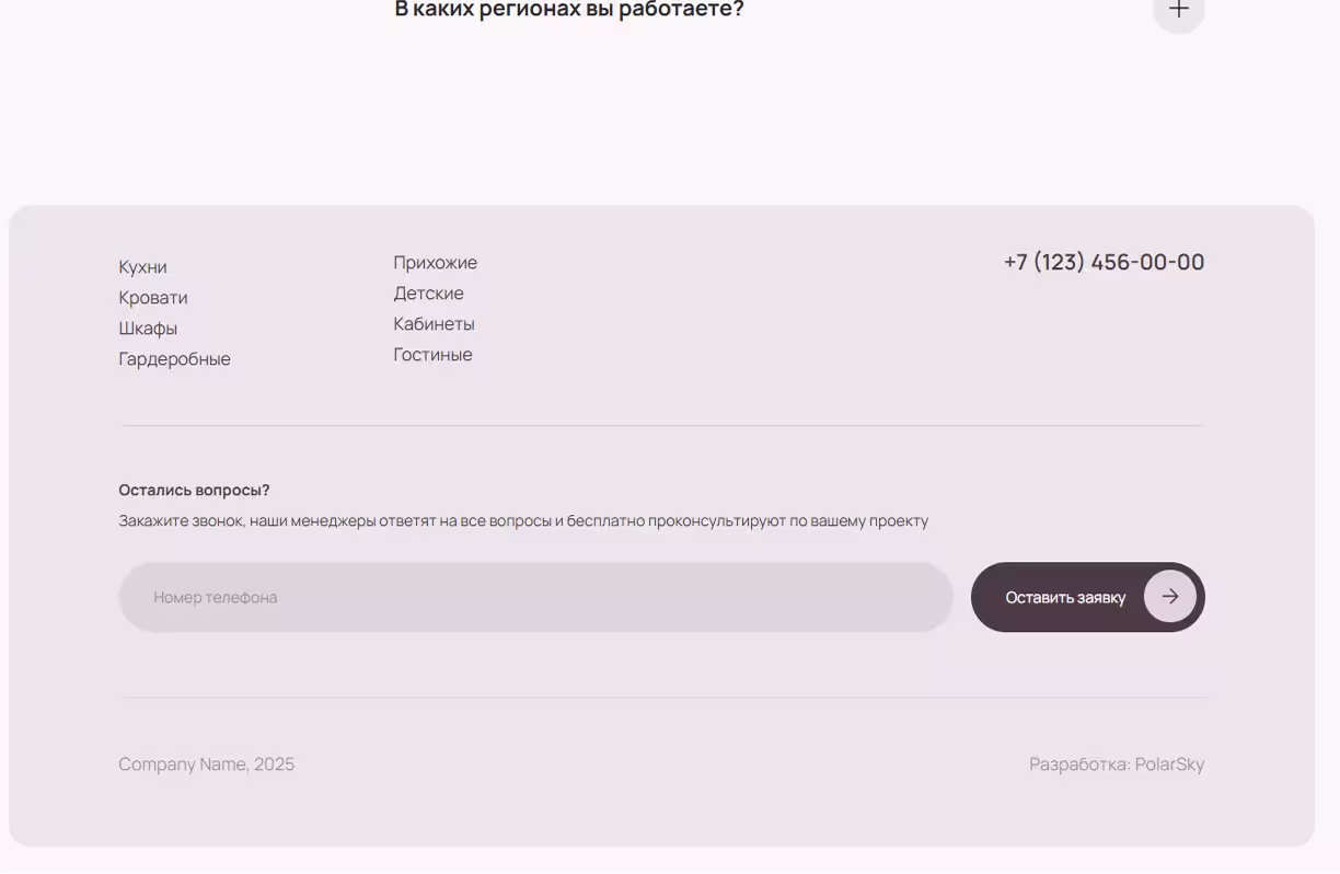 Визуализировали этапы производственного цикла, создали удобный раздел с ответами на вопросы и разработали информативный подвал с навигацией и контактами для завершённого пользовательского опыта.