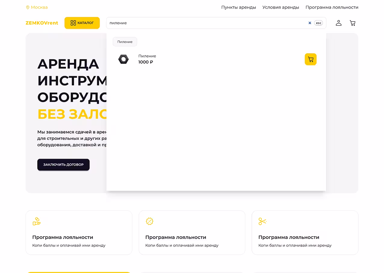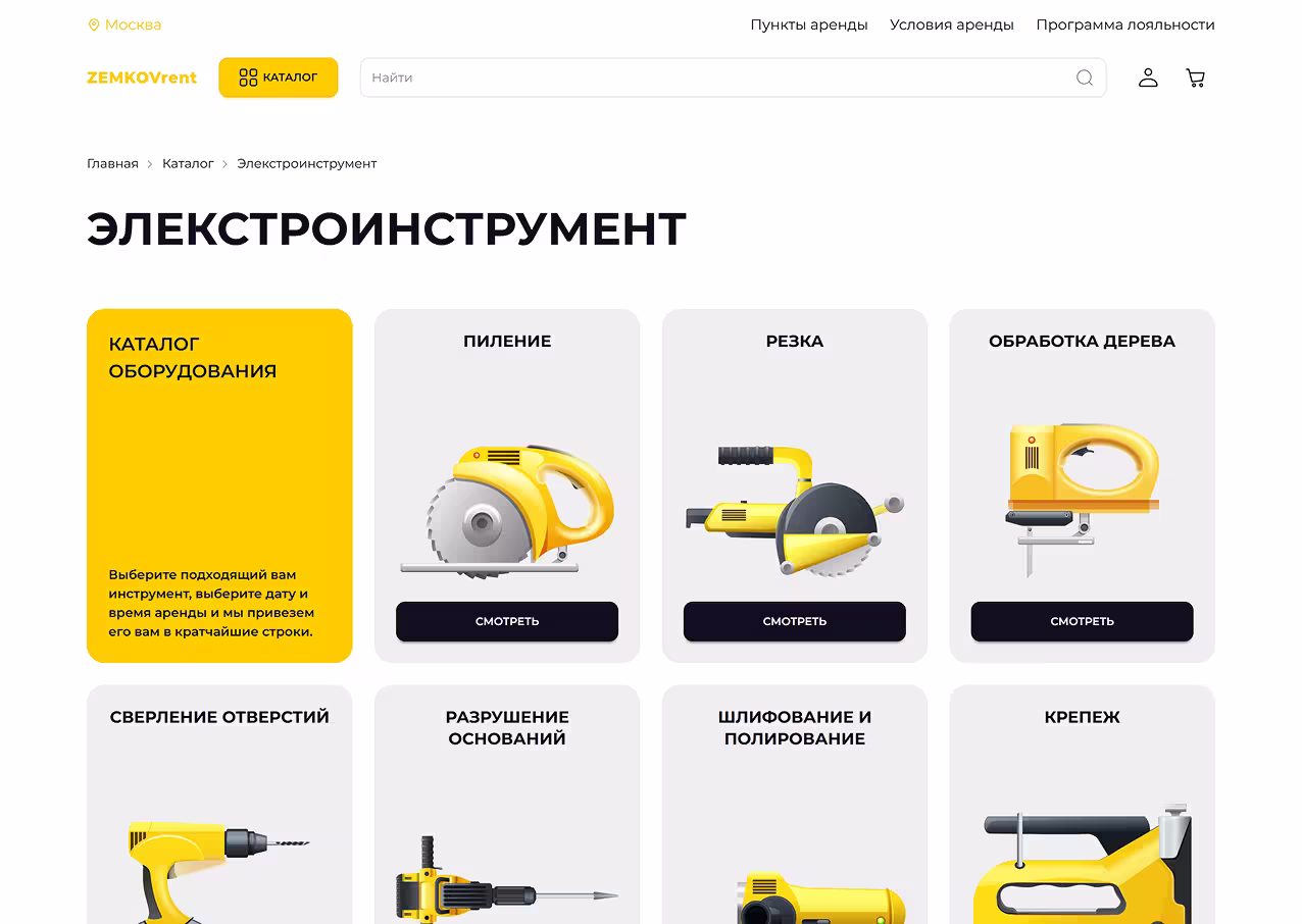 Визуальные карточки, фильтры и анимированный поиск помогают быстро находить нужный инструмент, мгновенно выдавая подходящие категории и товары прямо во время ввода.